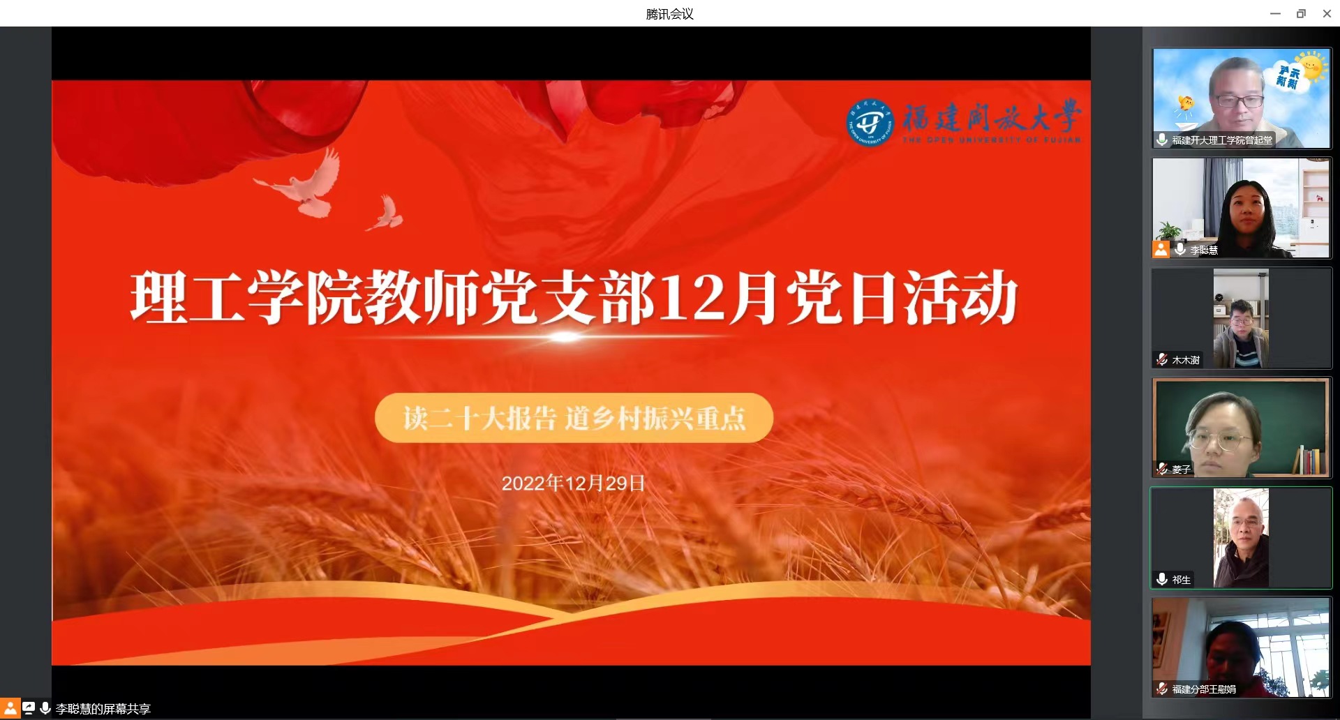 支部宣传委员李聪慧围绕“读二十大报告 道乡村振兴重点”主题,从“说乡村振兴、道二十大重点、人才培养大家谈”三个方面为全体党员上了一堂生动的微党课,并引导大家就乡村振兴与开放教育融合等工作展开热烈讨论。