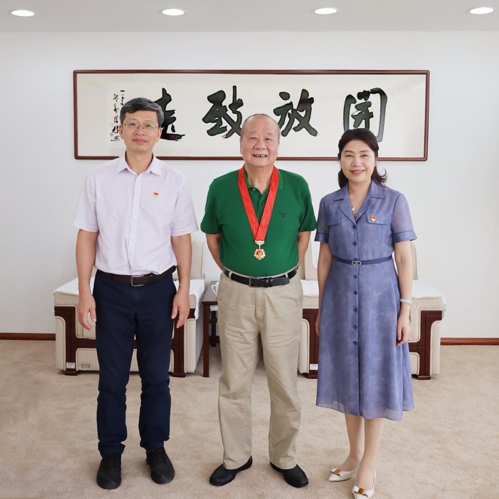 党委书记庄莉为科研处原处长黄宜樑同志(中)颁发纪念章
